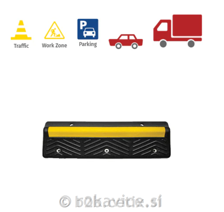 Kolesni ustavljalci so izdelani iz trde gume, so odporni na vse vremenske vplive in nudijo odlično absorpcijo udarcev. Opremljeni so z rumenimi odsevnimi vložki za večjo vidljivost. Namestitev je preprosta s pomočjo priloženih sider.