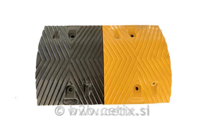 Model DH cestne hitrostne ovire iz črno-rumene gume so idealne za zasebna zemljišča, parkirišča in industrijske obrate. Sredinski moduli z vgrajenimi “mačjimi očmi” za boljšo vidljivost ponoči so zasnovani za upočasnjevanje prometa in večjo varnost. Enostavna namestitev za začasno ali stalno uporabo, odporni na vremenske vplive in obrabo. Največja dovoljena hitrost: 50 km/h.