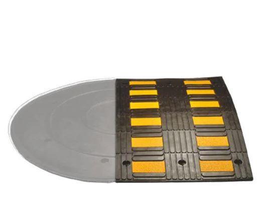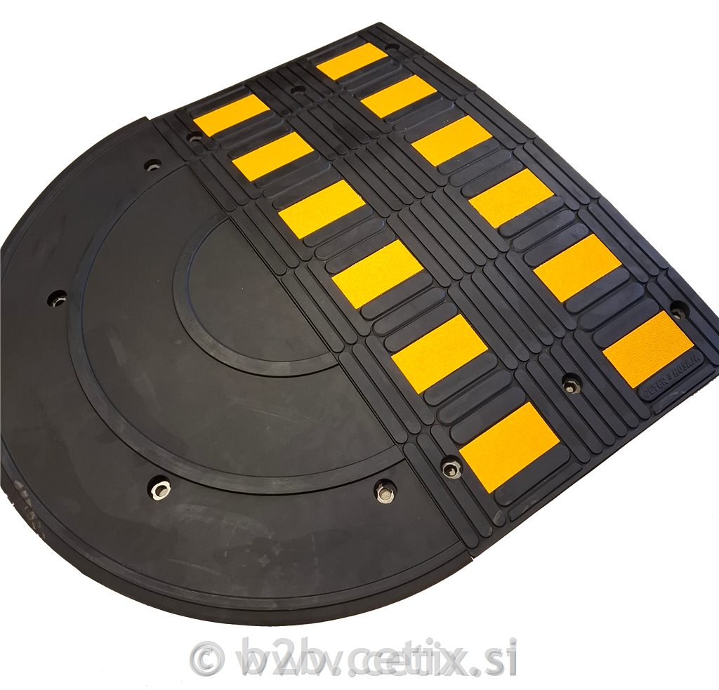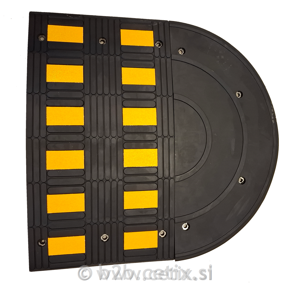 Črni gumijasti ležeči policaji z rumenimi odsevnimi trakovi. Opremljeni so z rumenimi odsevnimi in protizdrsnimi vložki za maksimalno vidljivost.